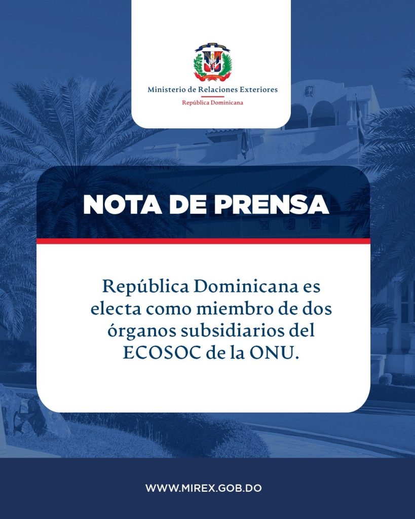 Santo Domingo de Guzmán, República Dominicana. – República Dominicana resultó electa para ocupar dos importantes posiciones a lo interno de los órganos subsidiarios del Consejo Económico y Social (ECOSOC) de la Organización de las Naciones Unidas (ONU), que le permiten consolidar su liderazgo y compromiso con la agenda global de los países miembros.