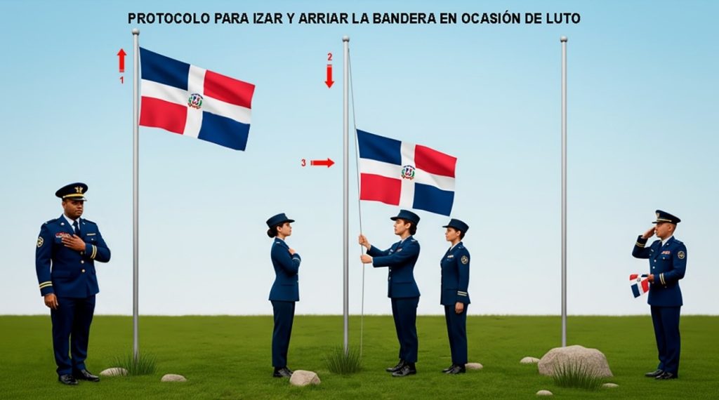 Cuando por motivos de duelo la bandera deba izarse a media asta, primero deberá elevarse hasta el tope y luego llevarse hasta la posición de media asta. Nunca debe permitirse que la bandera toque tierra.