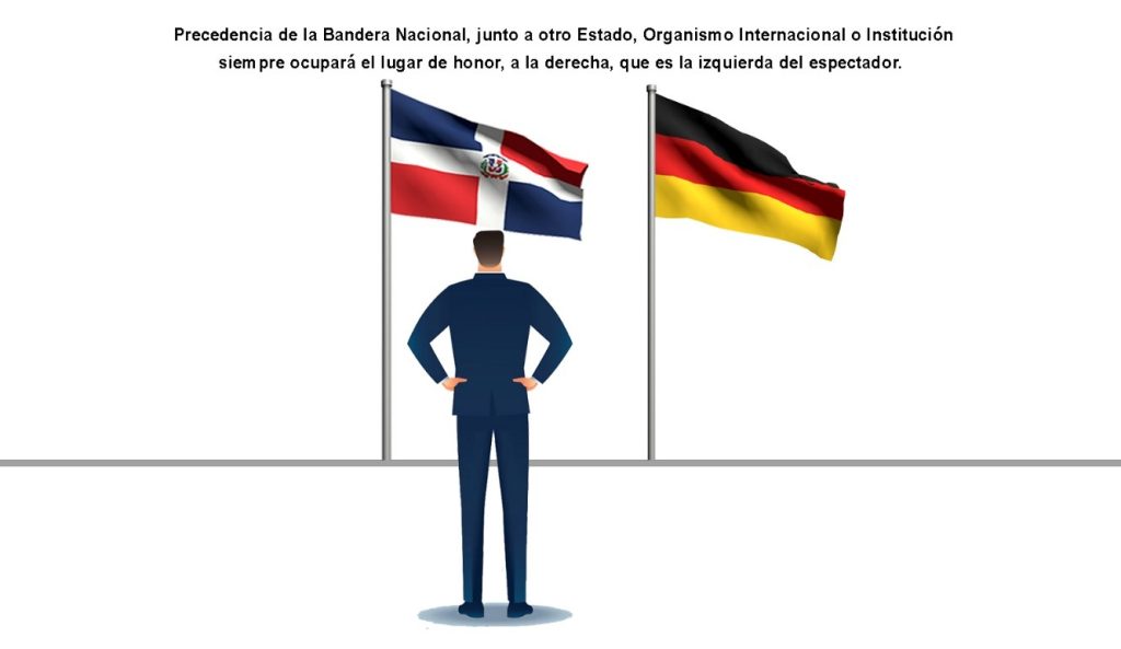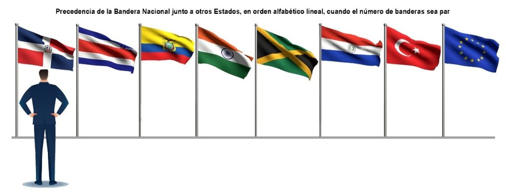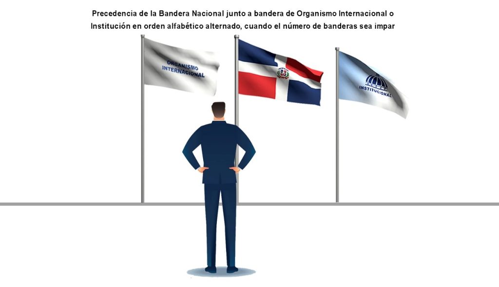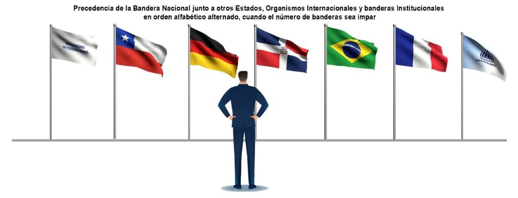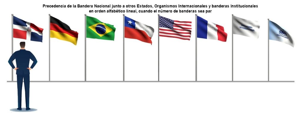 Colocación de bandera junto a la de otros Estados. Cuando la Bandera Nacional de la República Dominicana deba ser enarbolada junto a la de otros Estados en ocasión de actividades internacionales, serán tomadas en cuenta las normas y usos internacionalmente establecidos.