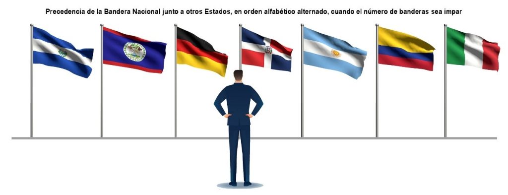 Al izarse la Banderas Nacional junto a dos o más banderas de otras naciones, deberán ser izadas en tres (3) astas separadas o colgadas de diferentes cuerdas de igual tamaño y al mismo nivel.
